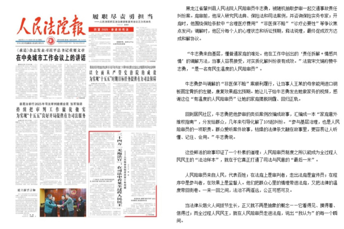 1月16日,《人民法院报》头版刊发长篇通讯《三十四万“无袍法官”:在司法中看见全过程人民民主——人民陪审员制度改革十年观察》,全景式展现了党的十八大以来人民陪审员制度的发展历程与显著成效。报道中,“两处、多段落”源引肇州县人民法院人民陪审员牛志勇的陪审心得及案例,其深度参审、实质履职的生动实践,成为展现司法民主、传递司法温度的一个个亮眼缩影。