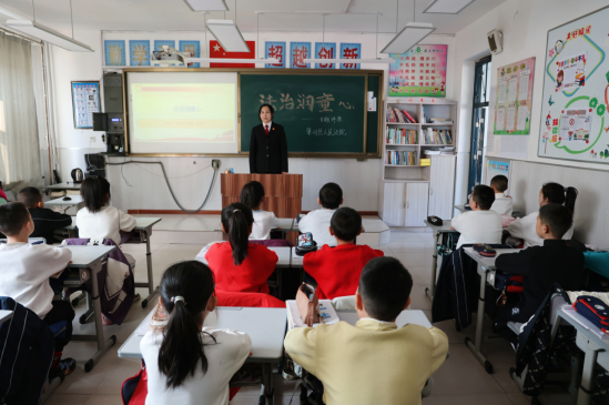 教室里,孩子们坐姿端正,目光中闪烁着好奇与期待。苏专委以《道德经》节选中的哲思与寓言故事“水滴石穿”的坚持为例,将传统文化中的法治智慧化作润物无声的启蒙,引导孩子们从优秀传统文化中汲取法治智慧。“学法,不是一天两天的事,就像水滴石穿一样,每天懂一点、每天做一点,法律的意识和法治的底线,就会在你们心里慢慢扎根。”面对诱惑如何选择?遭遇欺凌如何求助?在轻松愉悦的氛围中,孩子们不仅收获了有关法律知识,更在心中种下了敬畏法律、坚守底线的种子。